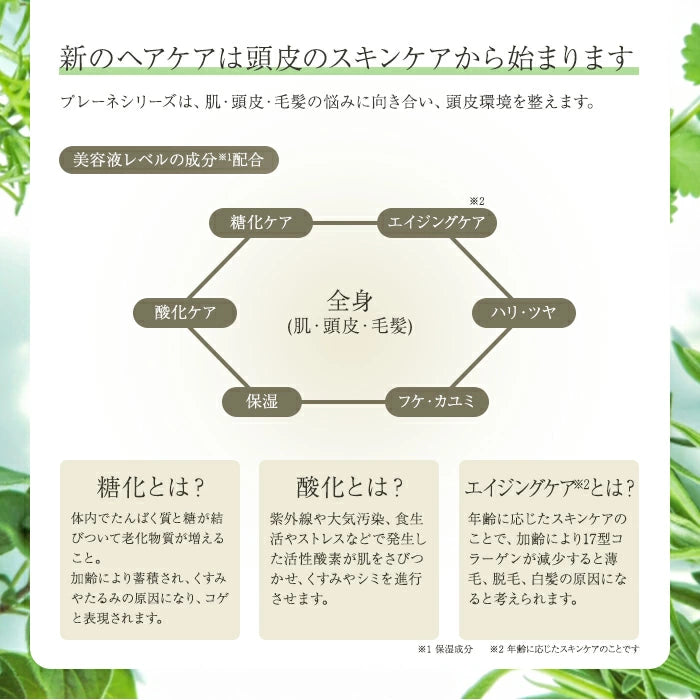 エイジングの気になる毛髪に12種の植物エキスがキューティクルを整え、ダメージ毛をなめらかにまとめ、本来の美しいツヤをとりもどし、ハリ・コシを与えます。